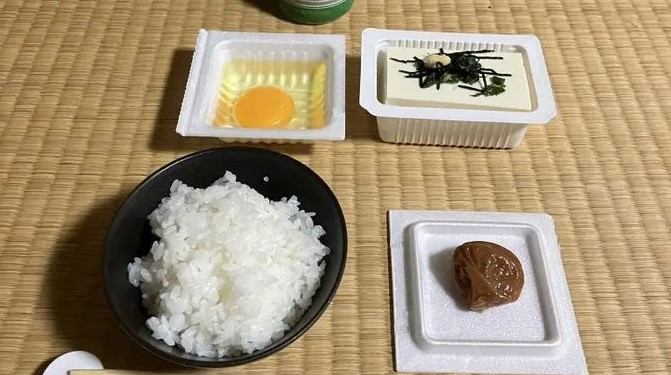 去年6月一名45歲的日本男性秀晚餐的貼文爆紅,一時成為日本的話題人物。他的餐桌上沒有任何肉類和魚類,只有白米飯、一顆醃梅乾、一顆雞蛋和一塊豆腐。