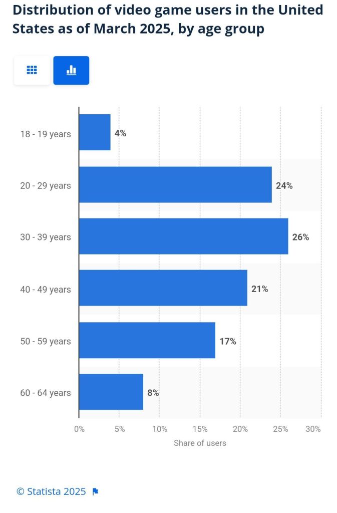 電玩遊戲發展了數十年,遊戲不再只是年輕人的專屬興趣。根據statista數據,美國50歲以上的玩家數量已攀升至5700萬,在總玩家群體中佔高達25%。從益智的手機遊戲到,到緊張刺激的槍戰遊戲,都有一群中老年玩家切身參與。