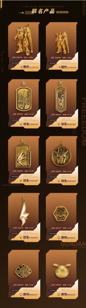 除了這些鋼彈外,本次連動還包括5款足金掛墜與3款足金腕飾,售價在1580至9360人民幣不等,前3000名購買的用戶還可獲得老鳳祥鋼彈限量冰箱貼。