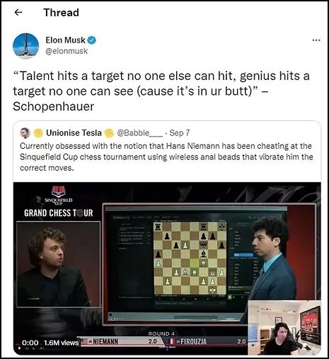 一時間,「智慧肛珠」成為網絡熱議的話題。儘管有各種各樣作弊的澄清,但討論到最後大家似乎已經不在意尼曼是否真的作弊了。更多人好奇的是他屁股裡有沒有肛珠,以及這種操作的可行性。就連同為國際象棋發燒友的馬斯克都參與進來,在自己社交帳號上調侃「有天賦的人擊中別人擊不中的靶子,天才擊中別人看不見的靶子(因為它就在你的屁股裡)」