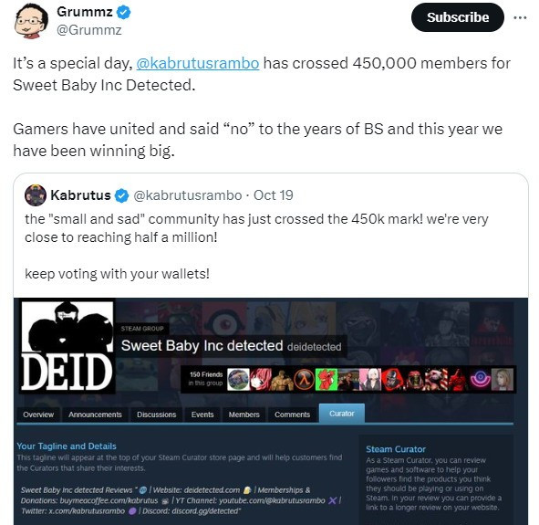 前暴雪製作人Grummz對此評論道:「這是一個值得特別的時刻,「Sweet Baby Inc Detected」的關注人數已經超過了45萬。玩家們團結一致,堅定的拒絕多年來存在的不公與荒謬現象。」