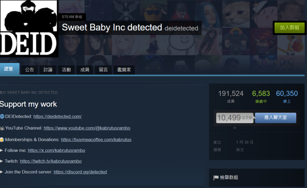 在此同時,Sweet Baby Inc Detected群組的人氣也節節上升,已經有超過19萬個成員。近半年,開始不停出現DEI遊戲大爆死,抵制DEI影響的人也越來越多,或許打倒這個不良之風並不遠。