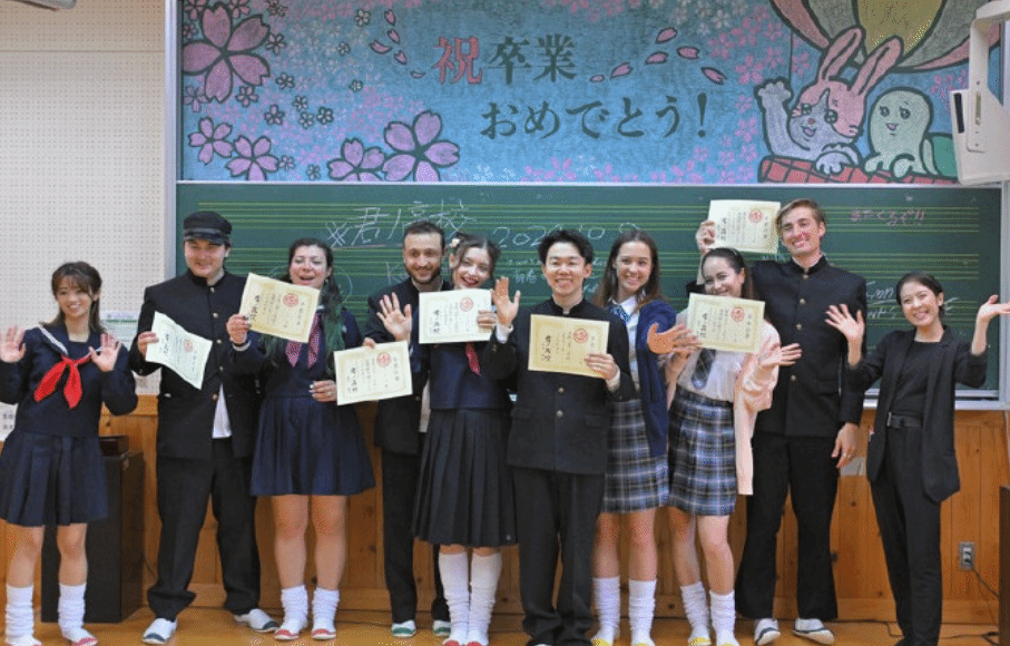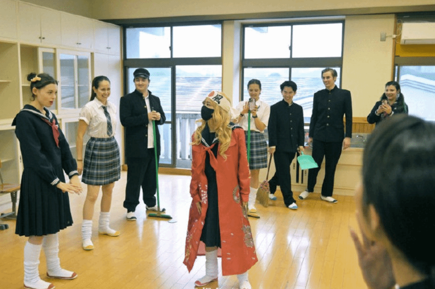 他們可以依喜好換上日式風格的學生製服,校服款式有非常多的選擇,基本標誌性服裝都可選,選好後分班級,一起站在「開學典禮」的看板前拍照留念。