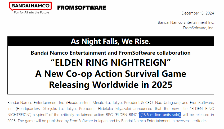 FromSoftware和萬代南夢宮在最近的新聞稿中公佈了《艾爾登法環》的最新銷售數據。文中提到,截至目前,遊戲已售出2,860萬份,目前銷售量正快速接近3,000萬份。