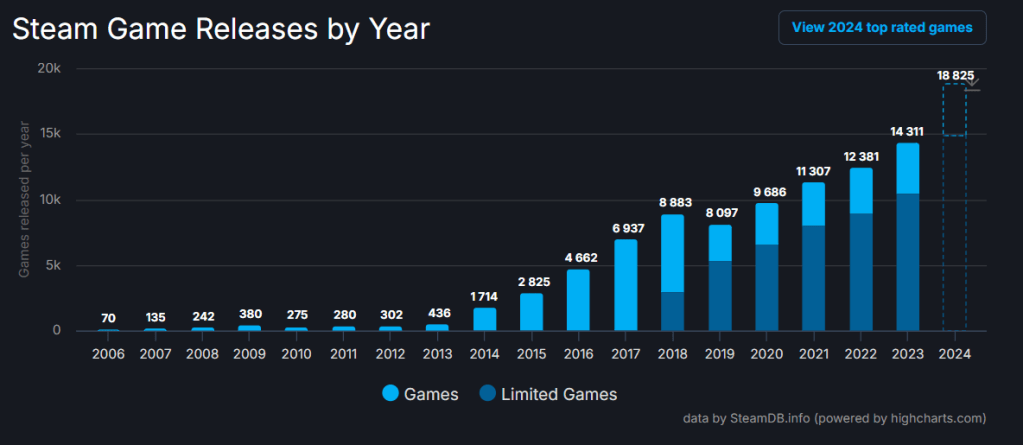自2019年開始,Steam連續五年的遊戲發表數量正成長。而今年更是比2023年多了整整4514款新作,較去年同期成長超31.5%。