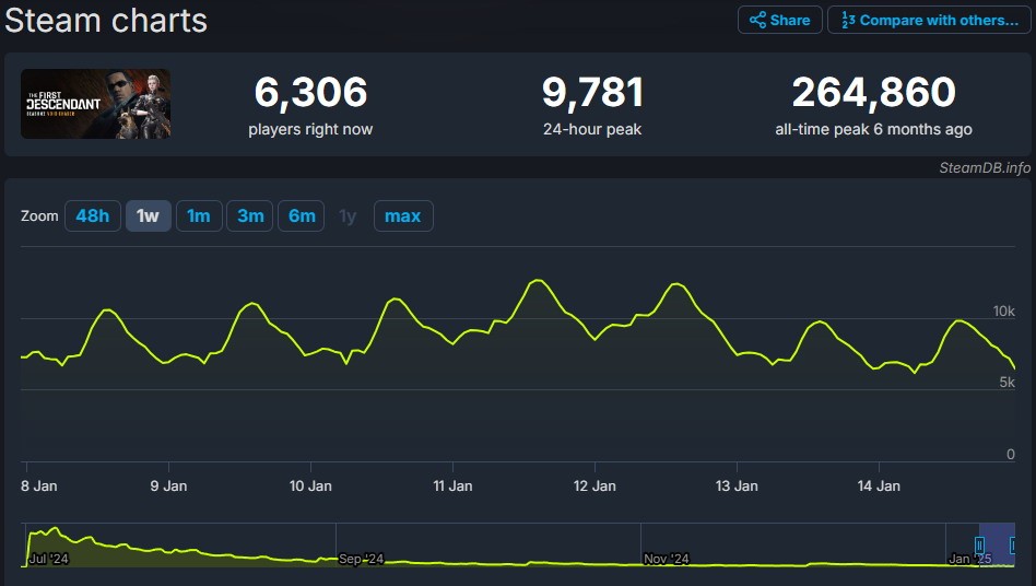 韓國Nexon 公司的免費射擊遊戲《第一繼承者》在2024 年夏季憑藉免費遊玩模式,以及西方遊戲業覺醒文化相反的美術吸引了大量玩家,Steam 玩家數峰值曾高達26.4 萬人。然而大半年過去,該遊戲玩家流失超95%,目前最高高峰僅9781 人。