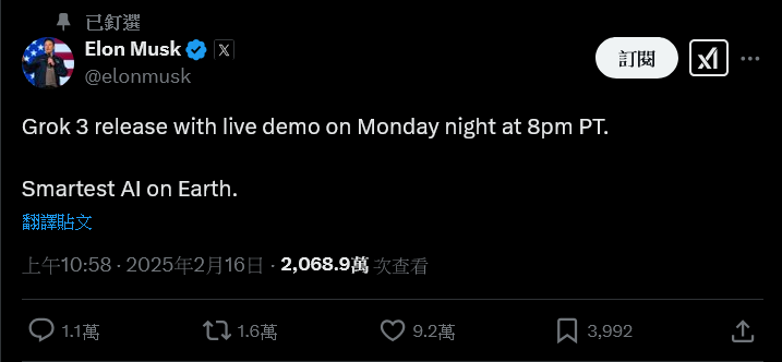 今日馬斯克在社群平台X上表示,Grok 3大模型將於太平洋時間週一晚上8點發布,屆時將進行現場演示,馬斯克稱其為地球上最聰明的人工智慧。