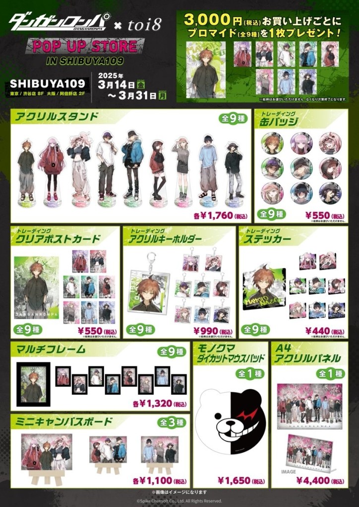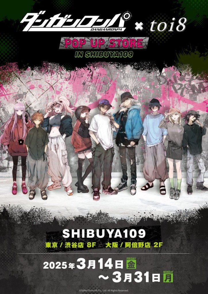 WALLMA宣布以《彈丸論破》為主題的快閃店將於2025年3月14日至31日在澀谷舉行。這次活動設於澀谷109,粉絲們將有機會購買到由插畫家toi8為人氣角色新繪製的周邊商品,包括徽章和壓克力立牌。這些插圖展示了角色的獨特服裝,與角色平日製服風格形成鮮明對比。