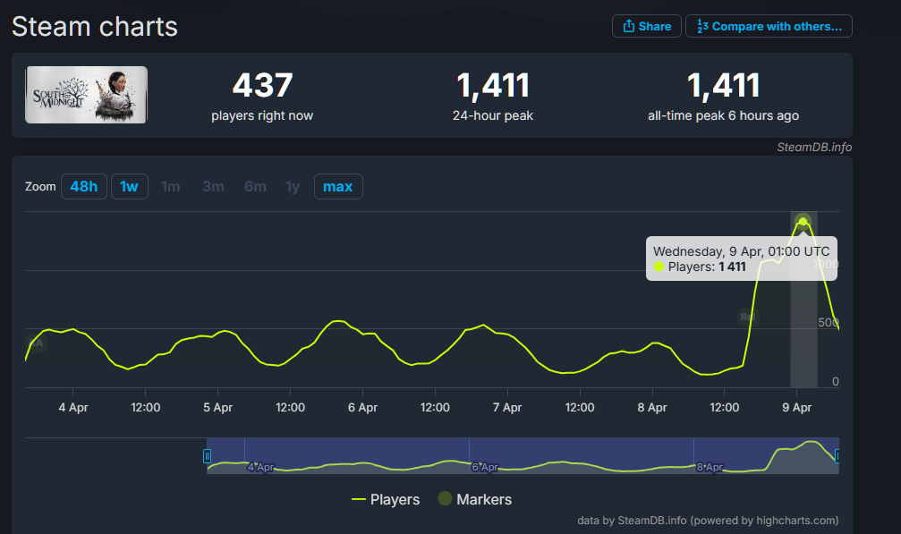 雖然Steam評價有93%好評,但根據SteamDB數據顯示,本作正式發售首日Steam線上玩家高峰來到1411人,僅剩400人還在遊戲中,比玩先行版的人還少。