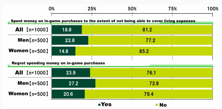調查顯示,18.8%的受訪者坦言「曾因在遊戲內課金過度,而一度難以支付日常生活開支」;同時,23.9%的人對自己曾經的遊戲消費表示後悔。對於「為了在遊戲中占得優勢,我願意付費」的說法,17.9%的年輕人表示同意,其中男性比例高達23.8%,較去年增長7.6個百分點。而在「如果不課金就無法享受遊戲」的問題上,20.8%的受訪者表示認同,比去年上升2.7個百分點。