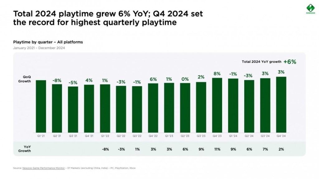 根據調查數據顯示,2024年玩家們在遊戲中所投入的時間比去年增長了6%,其中PC和Xbox玩家數量沒有太大變化,PS5玩家倒是增長了21%。