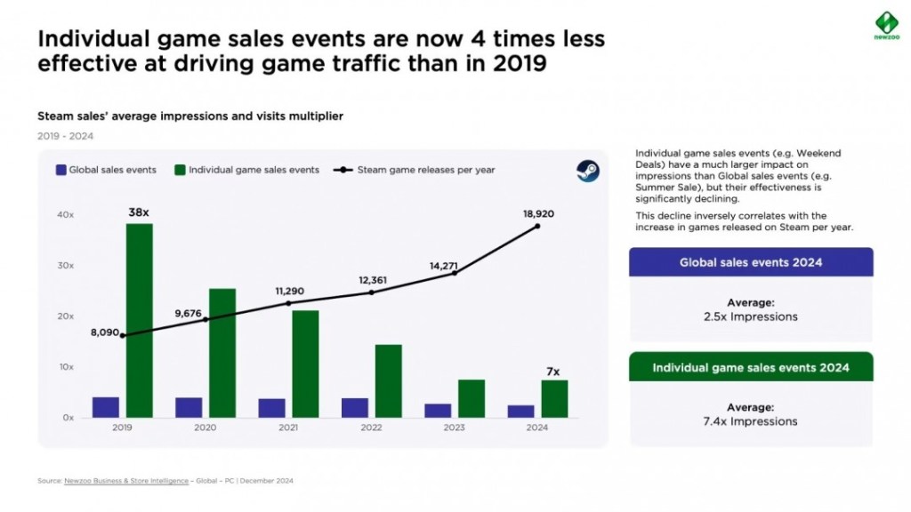 New Zoo對此解釋稱,Steam玩家每年接觸低於3款遊戲的玩家佔比,從2021年的22%提升到2024年的34%,相當於約1/3的玩家進入了不太想碰新遊戲的狀態。全平台平均接觸新作的數量則為11款,也是歷年新低。