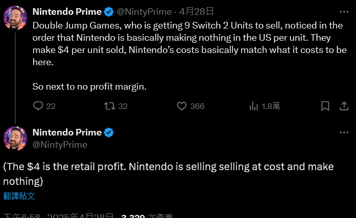 根據推特的遊戲部落客NintyPrime的消息稱,即使在美國的定價450美元,但任天堂在主機本身仍賺不到什麼錢。 任天堂的成本基本上與美國的定價持平,幾乎沒有任何利潤率,同時零售商的利潤每台只有賺4美元。