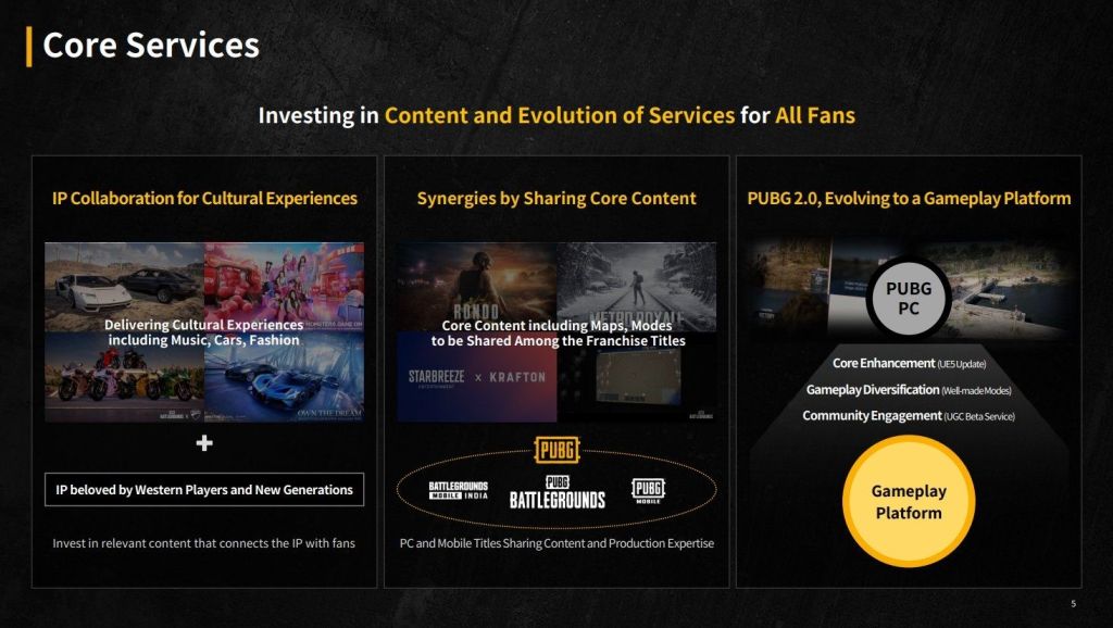 根據PUBG系列負責人TC Jang的說法,Krafton的目標是將PUBG打造成一個跨類型、跨引擎及跨世代的多層次遊戲平台。此策略建立在「遊戲即平台」及「IP即服務」的概念之上,並藉由統一品牌來整合多元的專案。