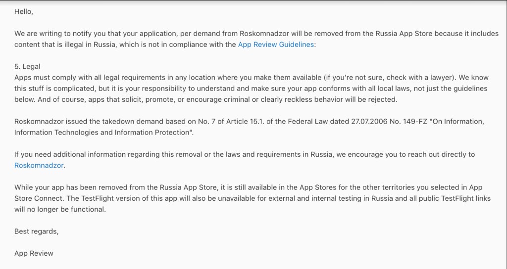 「我們寫信通知您,根據Roskomnadzor 的要求,您的應用程式將從俄羅斯應用程式商店中刪除,因為它包含在俄羅斯非法的內容,不符合應用程式審查指南,」發送給您的一封信中寫道。
